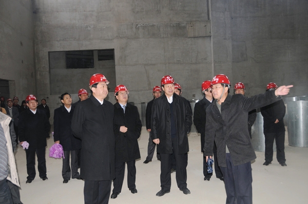 董事長徐鵬強(前排右一)向許立全書記(前排左一)等領導介紹工程建設情況