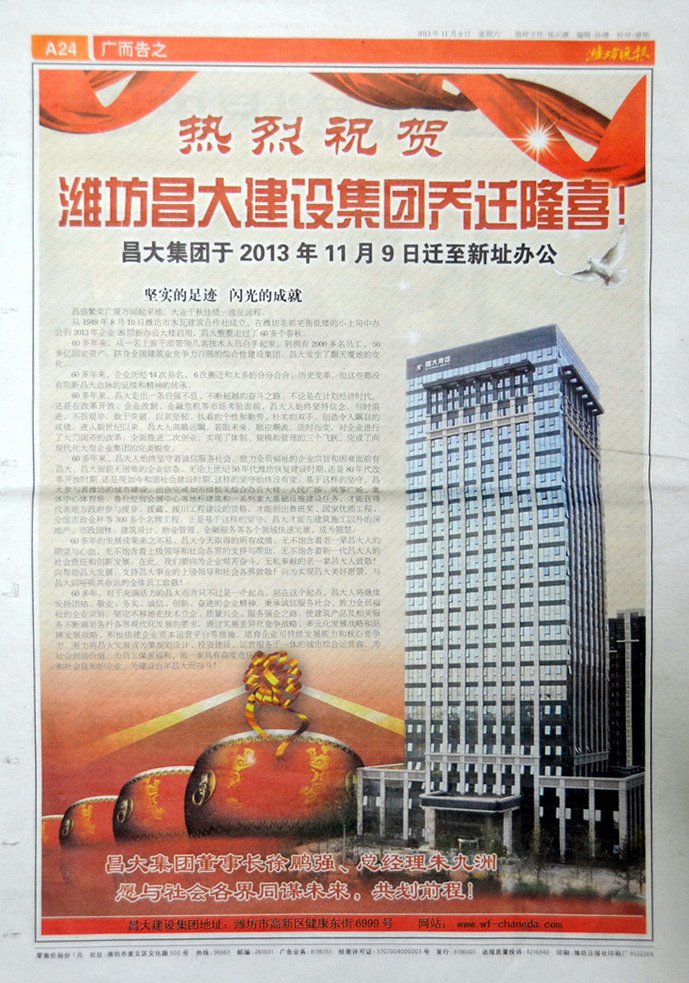 2013年11月09日,集團喬遷至高新區健康東街6999號,濰坊日報、濰坊晚報刊登集團喬遷慶典的報道。