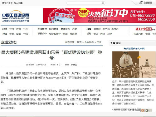 集團5名建造師榮獲山東省“百優(yōu)建設執(zhí)業(yè)師”稱號——中國工程建設網(wǎng)“企業(yè)動態(tài)”2014.12.0