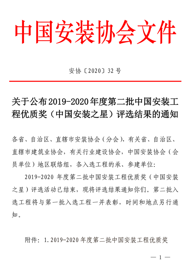 2020年12月10日,中國安裝協會發布通知,通報2019-2020年度第二批中國安裝工程優質獎(中國安裝之星)項目,共222項,集團安裝公司承建的濰坊市第二人民醫院門診病房綜合樓一期(安裝工程)(第144位排序)榮獲該項榮譽。這也是集團建司以來首次參評并獲該項榮譽。據悉,該批次入選項目由272家會員企業擇優推薦,初審243項工程,后經專家審定了238項工程進入今年10月的現場復查,11月,再由大評委無記名投票,產生最終的222項工程入選2019-2020年度第二批中國安裝工程優質獎(中國安裝之星)。