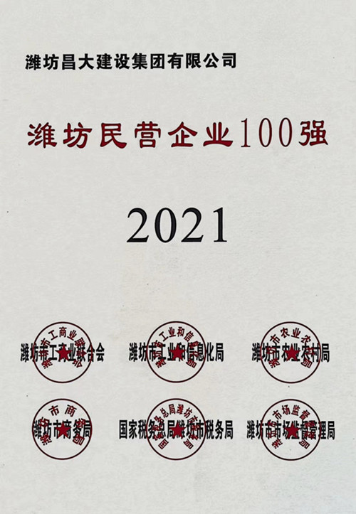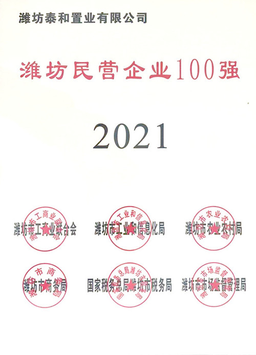 2021年11月18日下午,2021年濰坊民營企業100強發布會暨民營企業家座談會在市級機關綜合辦公大樓召開,市委副書記、市長劉運出席會議并頒獎。會上,發布了 2021年濰坊民營企業100強榜單及分析報告。集團公司總裁朱九洲作為百強民營企業代表領取獎牌。集團子公司泰和置業有限公司也再次入圍百強榜單。